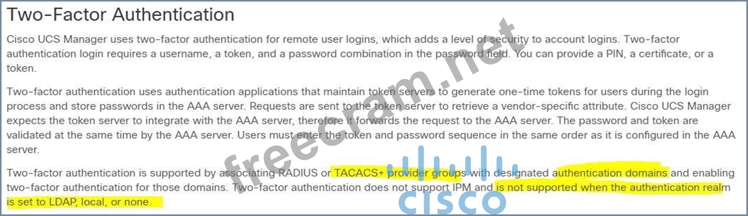 Due to new regulatory requirements from a third party, organization ABC must enable two- factor authentication for the Cisco UCS environment. The requirement is also to provide redundancy if the authentication server goes offline. Which three authentication components must be enabled to meet this requirement? (Choose three.)