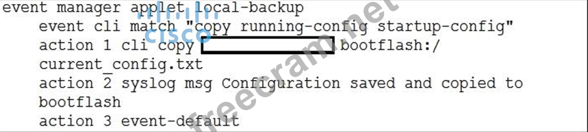 Refer to the exhibit. A network engineer must create an EEM script that saves a copy of the running configuration to bootftash and writes a message to syslog when a user saves the configuration to a Cisco Nexus 9000 Series Switch.