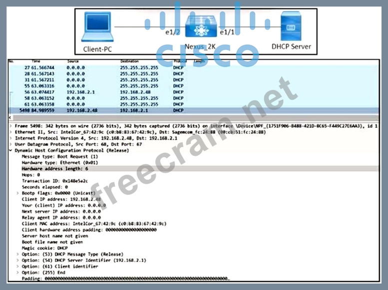 Refer to the exhibit. An engineer is troubleshooting intermittent connect issues between the client PC and the DHCP server. What does the last package captured from the Cisco Nexus 2000 Series Switch indicate?