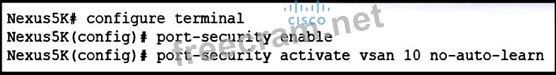 Refer to the exhibit. An engineer must configure port security on the Cisco Nexus 5000 Series Switch that meets these requirements: - Port security must be applied on VSAN 10 only. - NWWN 20:10:10:10:10:10:10:10 to log in through SAN port-channel 2. - Any WWN must be allowed to log in through interfaces fc1/1, fc1/2, fc1/3. - Auto learning must be disabled. Which command set satisfies these conditions?