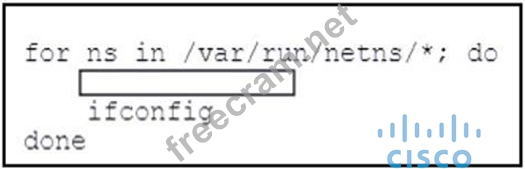 Refer to the exhibit. An engineer must create a Bash script to run in the Cisco NX-OS Guest Shell. The script must loop through the available namespaces and output all registered interfaces.