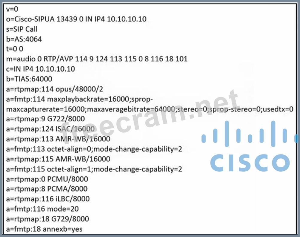 Refer to the exhibit. https://i.postimg.cc/C57TkczG/image.png A call is falling to establish between two SIP Devices The called device answers with these SOP Which SOP parameter causes issue?