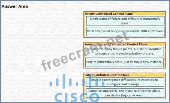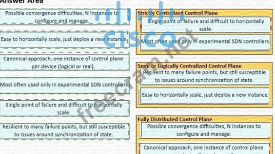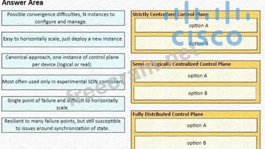 Network operators have many options available, from fully centralized to fully distributed control planes, and each approach has its own set of characteristics. Drag and drop the characteristics from the left onto the corresponding approach on the right.