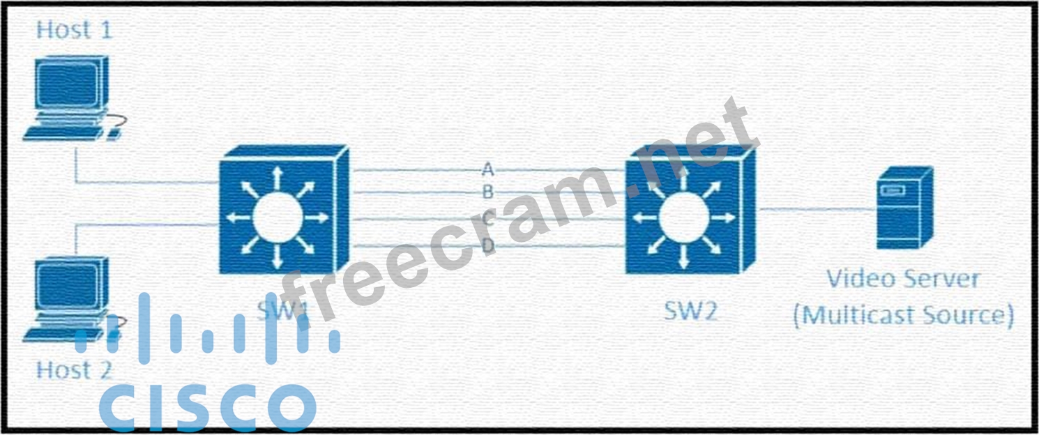 Traffic was equally balanced between Layer 3 links on core switches SW1 and SW2 before an introduction of the new video server in the network. This video server uses multicast to send video streams to hosts and now one of the links between core switches is over utilized Which design solution solves this issue?