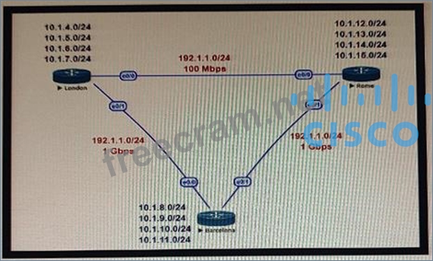 This network is running OSPF as the routing protocol. The internal networks are being advertised in OSPF London and Rome are using the direct link to reach each other although the transfer rates are better via Barcelona Which OSPF design change allows OSPF to calculate the proper costs?