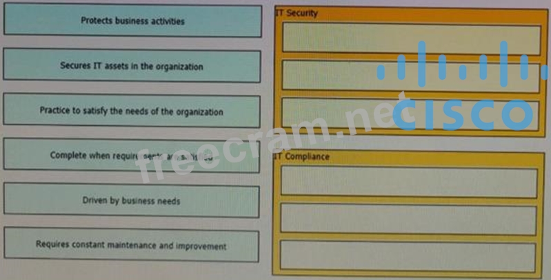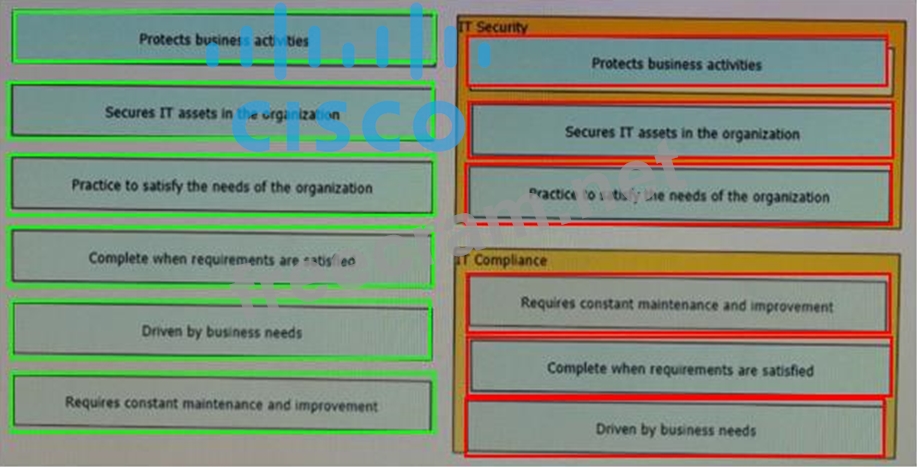 The line between security and compliance is easily blurred and is, to a large extent, a moving target Drag and drop each of the requirements on the left to the appropriate section on the right