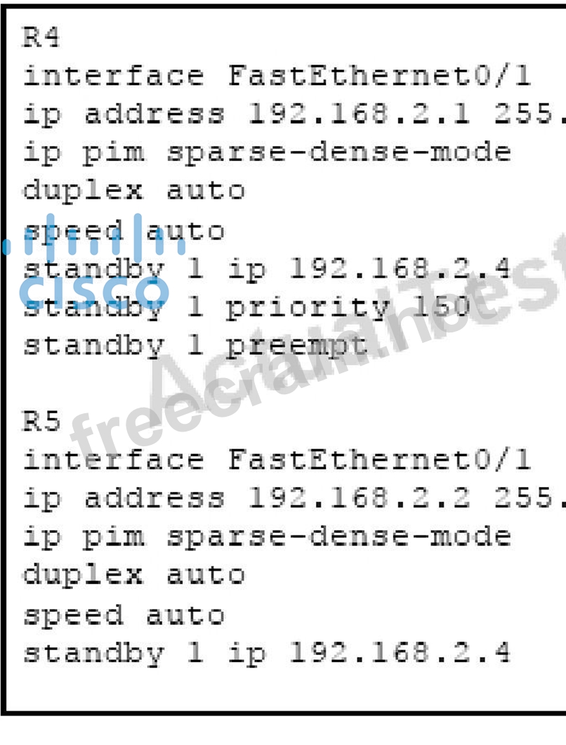 The interface FastEthernet0/1 of both routers R4 and R5 is connected to the same Ethernet segment with a multicast receiver. Which two statements are true? (Choose two)
