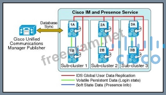 In this high-availability Cisco IM and Presence deployment with three subclusters, the first user is assigned to server 1A; the second user is assigned to server 2A; and the third user is assigned to server 3A.