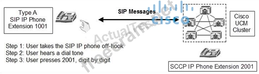 A user is going through a series of dialing steps on a SIP Type A IP phone to call a SCCP IP phone. Both phones are registered to the same Cisco Unified Communications Manager cluster. Assume that the calling SIP phone is not associated with any SIP dial rules.