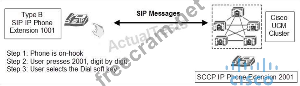 A user is going through a series of dialing steps on a SIP Type B IP phone to call a SCCP IP phone. Both phones are registered to the same Cisco Unified Communications Manager cluster. Assume that the calling SIP phone is associated with a SIP dial rule with a pattern value of "2001".
