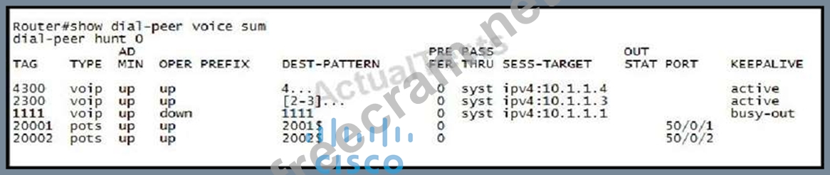 Refer to the exhibit. Which out-of-dialog SIP OPTIONS ping response put dial-peer tag 1111 into its current operational state?