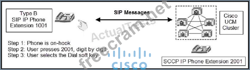 A user is going through a series of dialing steps on a SIP Type B IP phone to call a SCCP IP phone. Both phones are registered to the same Cisco Unified Communications Manager cluster.