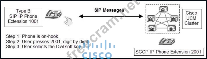 A user is going through a series of dialing steps on a SIP Type B IP phone to call a SCCP IP phone. Both phones are registered to the same Cisco Unified Communications Manager cluster. Assume that the calling SIP phone is associated with a SIP dial rule with a pattern value of "2001".