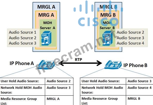 All displayed devices are registered to the same Cisco Unified Communications Manager server and the phones are engaged in an active call. Assuming the provided configurations exist at the phone line level and multicast MOH is disabled clusterwide, what will happen when the user of IP Phone B presses the Hold softkey?