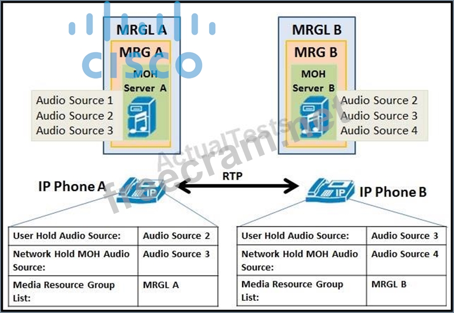 All displayed devices are registered to the same Cisco Unified Communications Manager server and the phones are engaged in an active call. Assuming the provided configurations exist at the phone line level and multicast MOH is disabled clusterwide, what will happen when the user of IP Phone A presses the Transfer softkey?