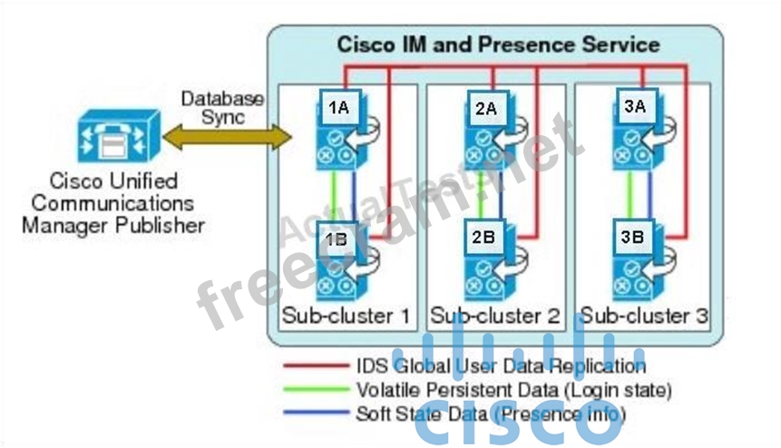 In this high-availability Cisco IM and Presence deployment with three subclusters, the first user is assigned to server 1A; the second user is assigned to server 2A; and the third user is assigned to server 3A.
