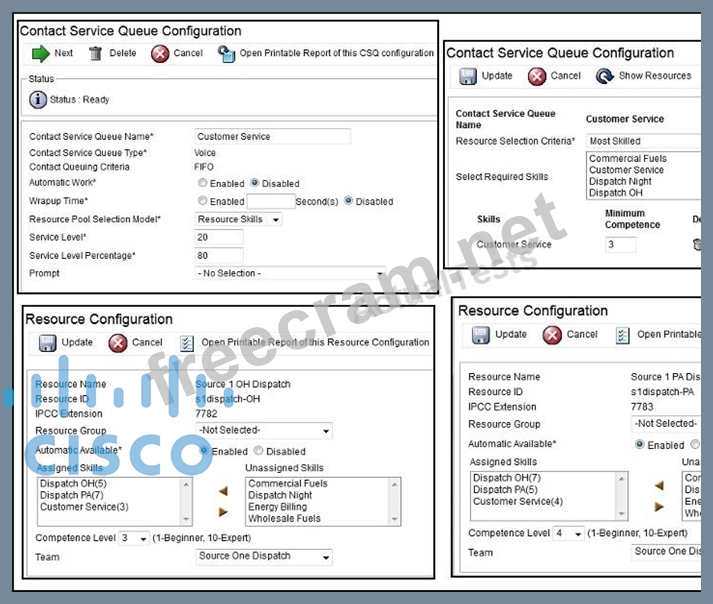 The Contact Service Queue (CSQ) controls incoming calls by determining where an incoming call should be placed in the queue and to which agent the call is sent. After you assign an agent to a resource group and assign skills, you need to configure the CSQs. You assign agents to a CSQ by associating a resource group or by associating all skills of a particular CSQ. Agents in the selected resource group or who have all the selected skills are assigned to the CSQ.