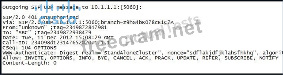 The exhibit shows an outgoing SIP 401 response message from Cisco Unified Communications Manager to a SIP VoIP service provider gateway. Which action can the Cisco Unified Communications Manager systems administrator use to change the response to "200 OK"?