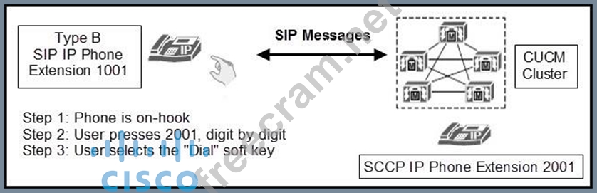 A user is going through a series of dialing steps on a SIP Type B IP phone (for example, a Cisco 7975) to call an SCCP IP phone. Both phones are registered to the same Cisco Unified Communications Manager cluster. Assuming the calling SIP phone is associated with a SIP Dial Rule with a pattern value of 2001, which statement about the call setup process of this call is true?