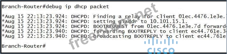 Refer to the exhibit. The exhibit shows the Cisco IOS CLI output of debug ipdhcp packet, which was captured on a router that is located at a branch office where a single IP phone is located. There is a standalone Cisco Unified Communications Manager server at the central site, which also provides DHCP services to the IP phone at the branch office. You are troubleshooting a problem where the IP phone received an IP address in the correct subnet and with a correct subnet mask from the DHCP server, but never completed registration 101 / 162 The safer , easier way to help you pass any IT exams. with Cisco Unified CM. Assuming the IP phone is correctly defined on Unified CM, which two statements the network components are true? (Choose two.)