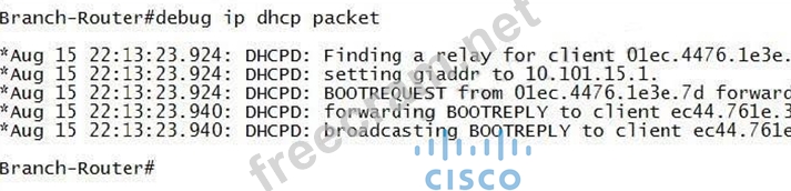 The exhibit shows the Cisco IOS CLI output of debug ipdhcp packet, which was captured on a router that is located at a branch office where a single IP phone is located. There is a standalone Cisco Unified Communications Manager server at the central site, which also provides DHCP services to the IP phone at the branch office. You are troubleshooting a problem where the IP phone could not register to Cisco Unified Communications Manager. You have confirmed that the IP phone received an IP address in the correct subnet and with a correct subnet mask from the DHCP server. Assuming the IP phone is correctly defined on Unified CM, which two statements about the network components are true? (Choose two.)