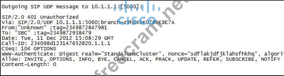 The exhibit shows an outgoing SIP 401 response message from Cisco Unified Communications Manager to a SIP VoIP service provider gateway. Which action can the Cisco Unified Communications Manager systems administrator use to change the response to "200 OK"?