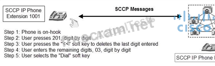 Refer to the exhibit. A user is going through a series of dialing steps on an SCCP IP phone (extension 1001) to cal another SCCP IP phone (extension 2003). Both phones are registered to the same CUCM cluster. Which user inputs are sent from the calling IP phone to the CUCM, in forms of SCCP message after the user pressed the Dial softkey? Note that the commas in answer choices below are logical separators not part of the actual user input or SCCP messages