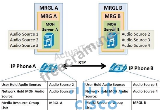 Refer to the exhibit. All displayed devices are registered to the same CUCM server and the phones are engaged in an active call. Assume that the provided configuration exist at the phone line level and multicast MOH is disabled cluster wide.