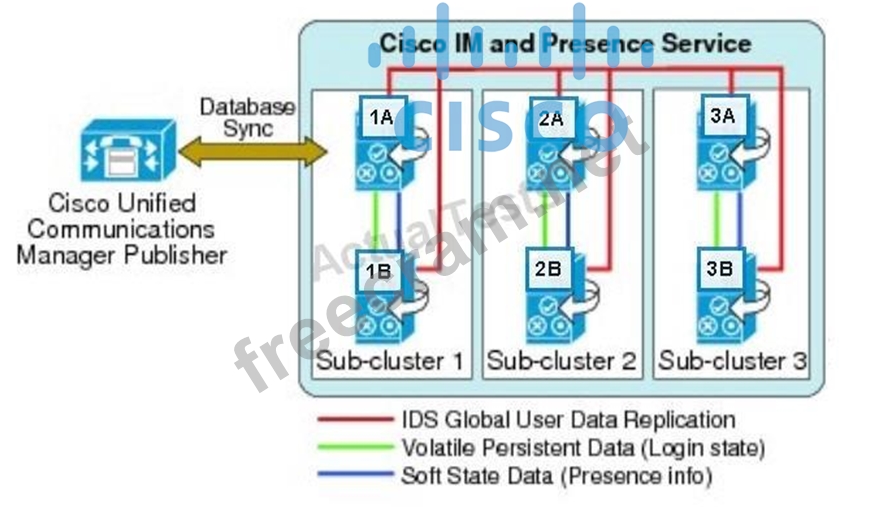 In this high-availability Cisco IM and Presence deployment with three subclusters, the first user is assigned to server 1A; the second user is assigned to server 2A; and the third user is assigned to server 3A.