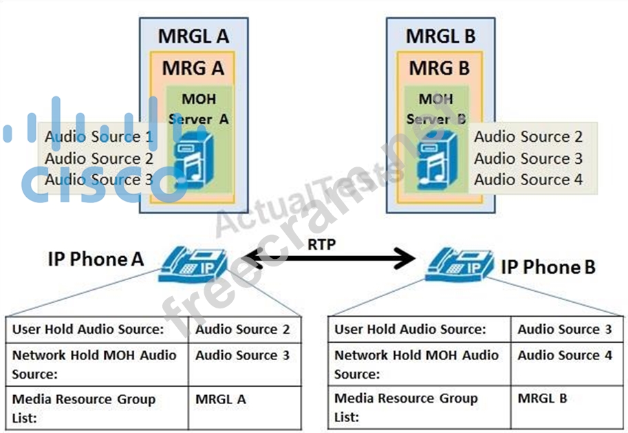 All displayed devices are registered to the same Cisco Unified Communications Manager server and the phones are engaged in an active call. Assuming the provided configurations exist at the phone line level and multicast MOH is disabled clusterwide, what will happen when the user of IP Phone A presses the Transfer softkey?