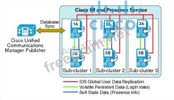 In this high-availability Cisco IM and Presence deployment with three subclusters, the first user is assigned to server 1A; the second user is assigned to server 2A; and the third user is assigned to server 3A.