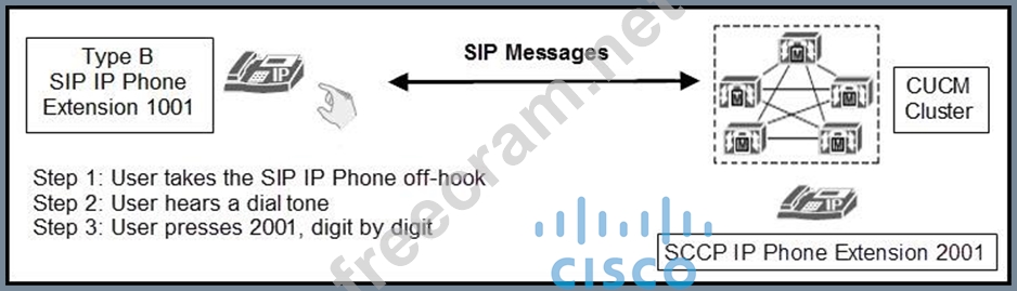 A user is going through a series of dialing steps on a SIP Type B IP phone (for example, a Cisco 7975) to call an SCCP IP phone. Both phones are registered to the same Cisco Unified Communications Manager cluster. Assuming that the calling SIP phone is not associated with any SIP dial rules, which statement about how digits are forwarded to Cisco Unified Communications Manager for further call processing is true?