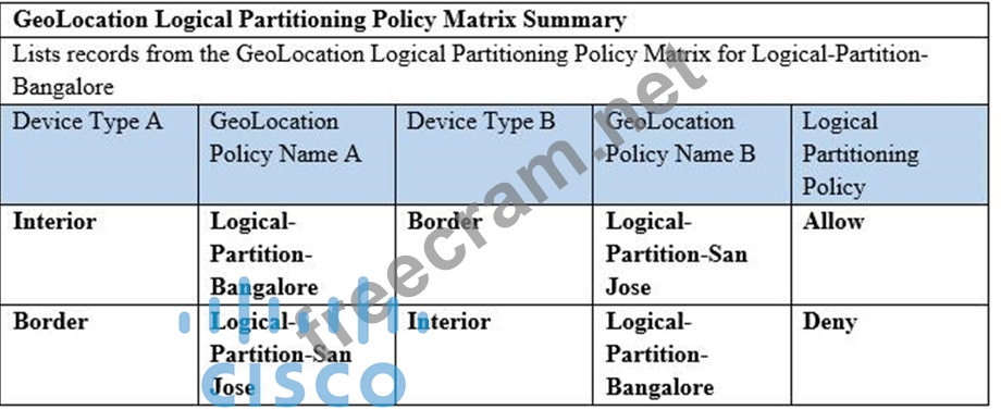 Refer to the exhibit. Assume that the bottom logical partition policy entry in Cisco Unified Communications Manager was provisioned last. How is the call treated when an IP phone in the Bangalore GeoLocation places a call to a MGCP gateway with FXO ports in the San Jose GeoLocation?