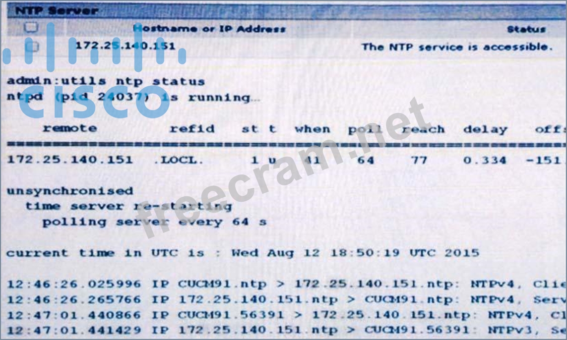 A network engineer is troubleshooting a NTP synchronized issue in CUCM. Why is NTP unsynchronized?