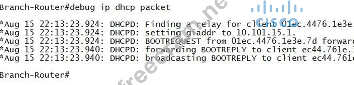 The exhibit shows the Cisco IOS CLI output of debug ipdhcp packet, which was captured on a router that is located at a branch office where a single IP phone is located. There is a standalone Cisco Unified Communications Manager server at the central site, which also provides DHCP services to the IP phone at the branch office. You are troubleshooting a problem where the IP phone could not register to Cisco Unified Communications Manager. You have confirmed that the IP phone received an IP address in the correct subnet and with a correct subnet mask from the DHCP server. Assuming the IP phone is correctly defined on Unified CM, which two statements about the network components are true? (Choose two.)