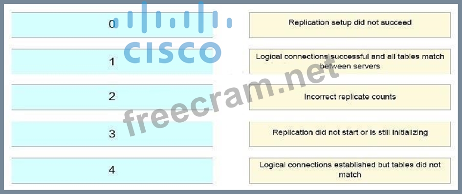 Drag and drop the Cisco Unified CM database replication status values on the left to the correct replication status definition on the right.