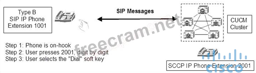 Refer to the exhibit. A user is going through a series of dialing steps on a SIP Type B IP phone (for example, a Cisco 7975) to call an SCCP IP phone. Both phones are registered to the same Cisco Unified Communications Manager cluster. Assuming the calling SIP phone is associated with a SIP Dial Rule with a pattern value of 2001, which statement about the call setup process of this call is true?
