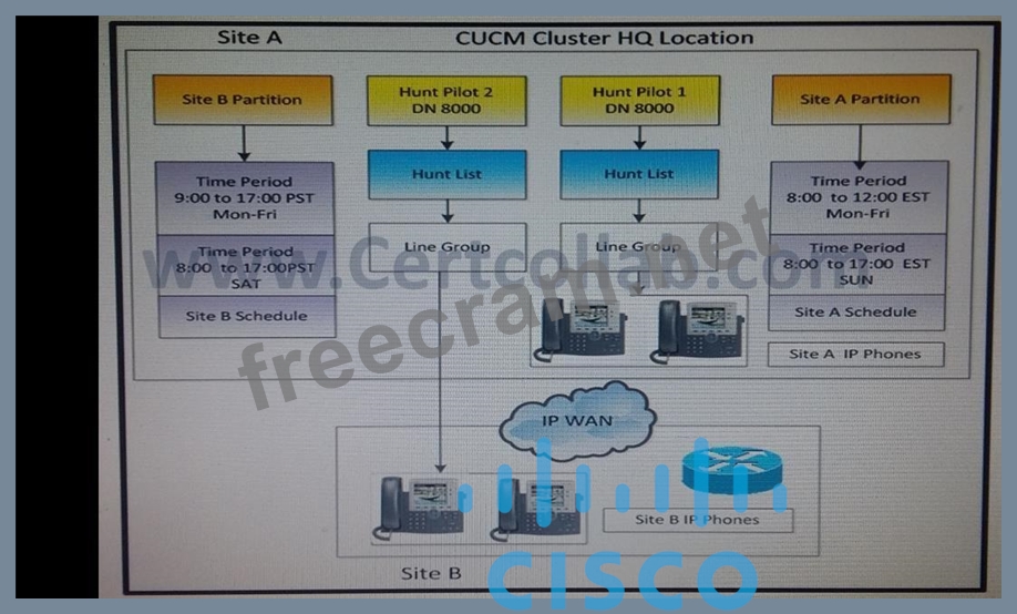 Refer to the exhibit. Site A and site B have a 3-hour time difference. An administrator has time-of- day routing configured at site A and site B for all incoming calls to the main phone number, DN