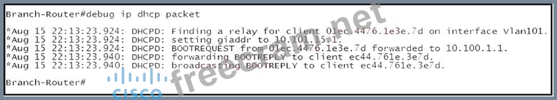 Refer to the exhibit. The exhibit shows the Cisco IOS CLI output of debug ip dhcp packet, which was captured on a router that is located at a branch office where a single IP phone is located.