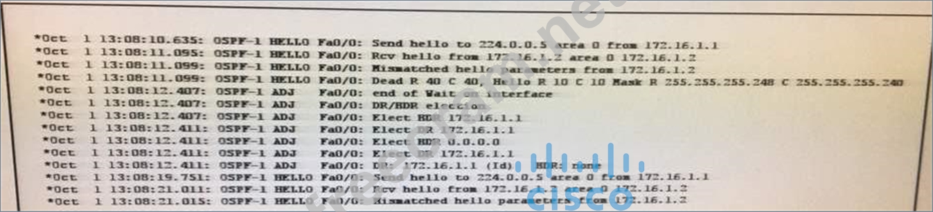 After observing that an OSPF neighbor relationship failed to form, you executed a debug that returned the given output. Which configuration issue prevented the OSPF neighbor relationship from forming?