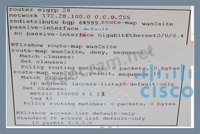 The route-map wan2site is being used for redistributing BGP routes into the eigrp 28 process Which option best describes the resulting redistribution of routes ?