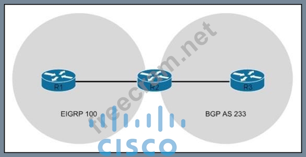 R2 is mutually redistributing between EIGRP and BGP. Which configuration is necessary to enable R1 to see routes from R3?