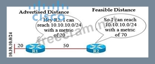 So in this case the feasible distance to network 10.10.10.0/24 is 20 + 50 = 70.