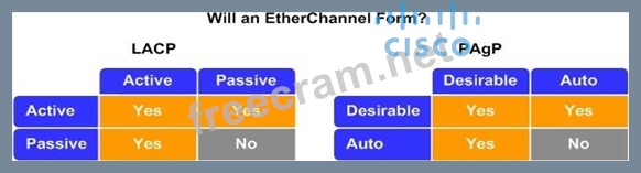 Which three modes are valid for forming an EtherChannel between the ports of two switches? (Choose three.)