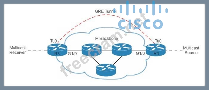 A tunnel is configured between R3 to R4 sourced with their loopback interfaces. The ip pim sparse-dense mode command is configured on the tunnel interfaces and multicast-routing is enabled on R3 and R4. The IP backbone is not configured for multicast routing.