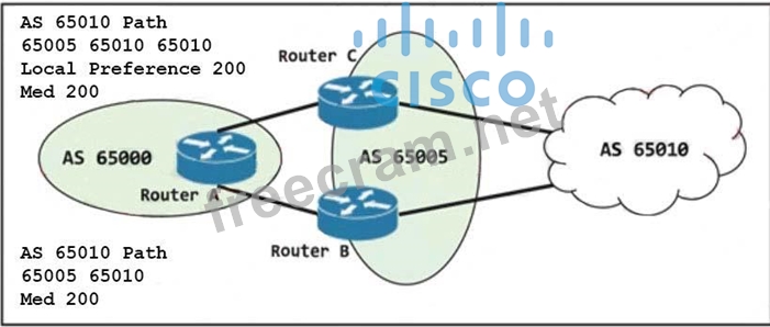 Refer to the exhibit. Router A is connected as a BGP neighbor to routers B and C. Which path does router A use to get to AS 65010?