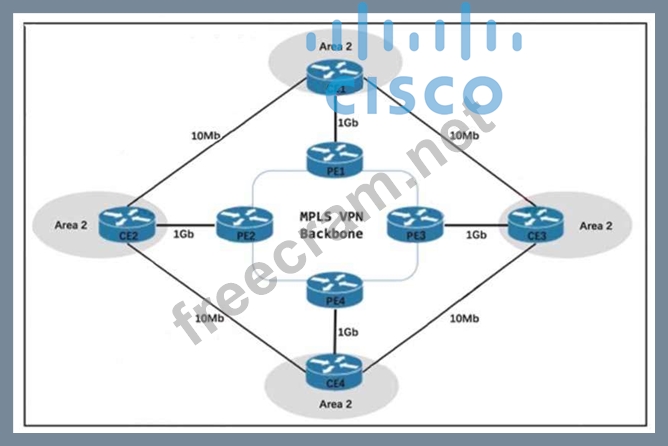 Refer to the exhibit. Your network uses an MPLS VPN backbone with OSPF between all PE and CE routers and on the 10Mb backup links between the CE routers. You notice that traffic from CE3 to CE2 and CE4 is flowing over the backup links instead of the higher-bandwidth MPLS VPN backbone even when the backbone is up. What change can you make to ensure that traffic uses the MPLS VPN backbone instead?