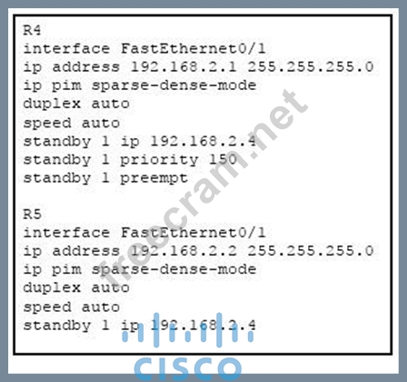 The interface FastEthernet0/1 of both routers R4 and R5 is connected to the same Ethernet segment with a multicast receiver. Which two statements are true? (Choose two)