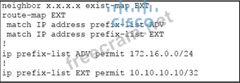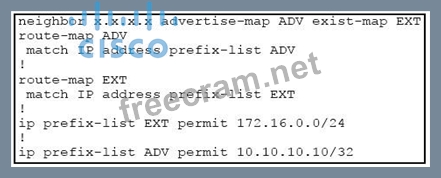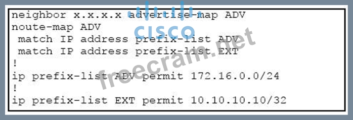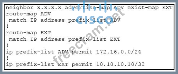 Question 102: Which set of commands conditionally advertises 172.16.0.0/24...