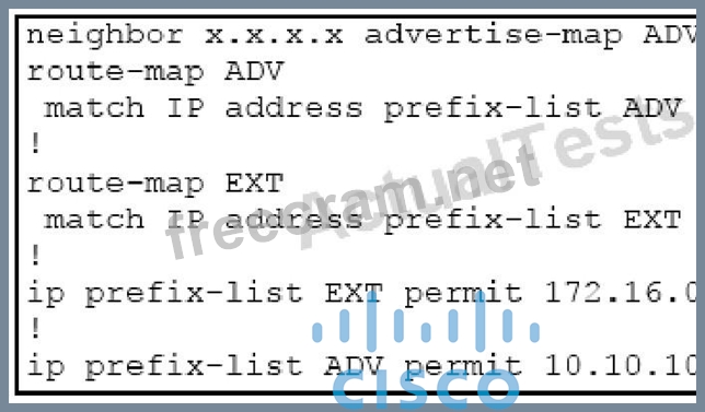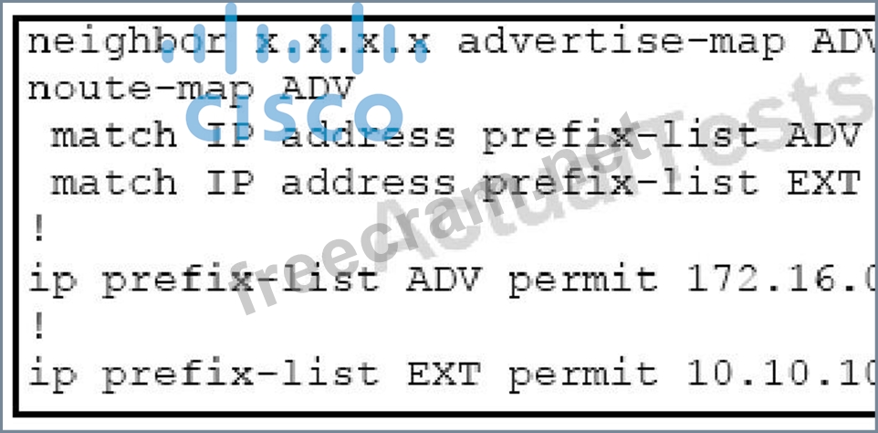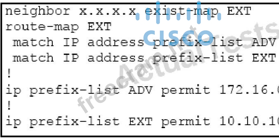 Question 196: Which set of commands conditionally advertises 172.16.0.0/24...